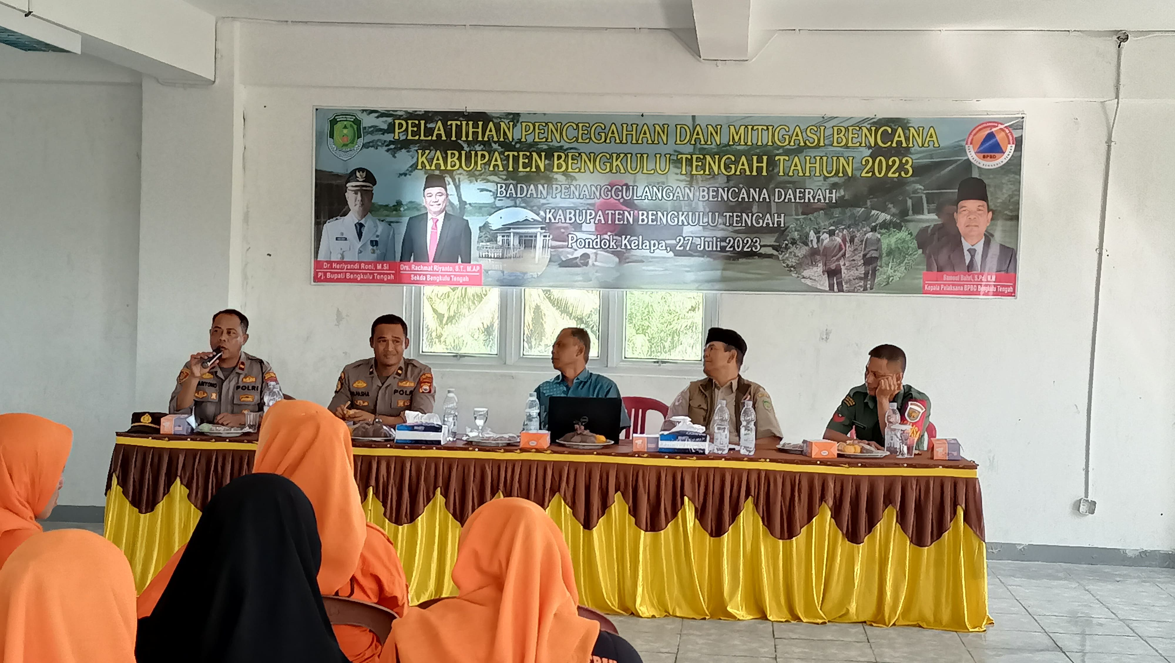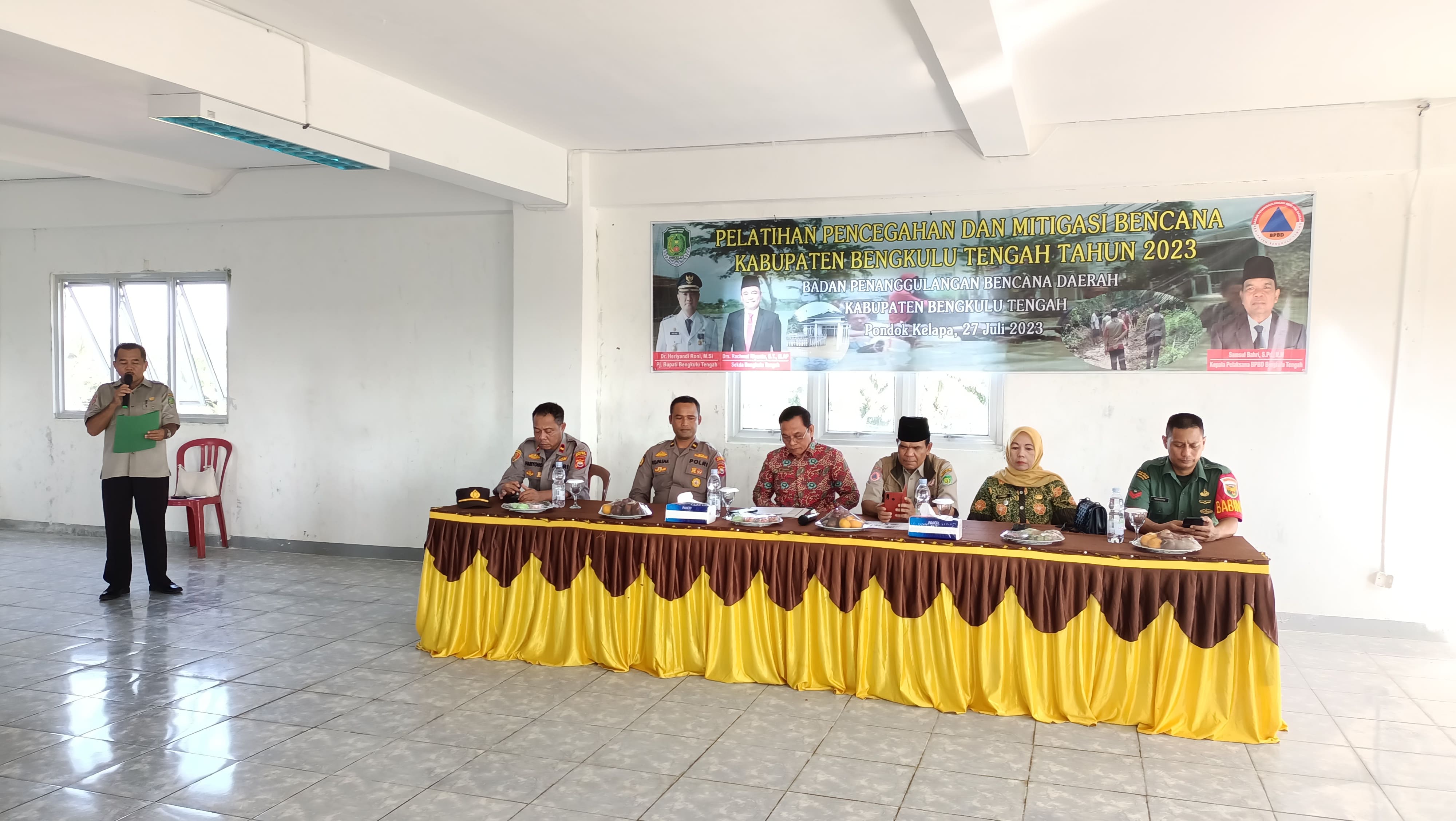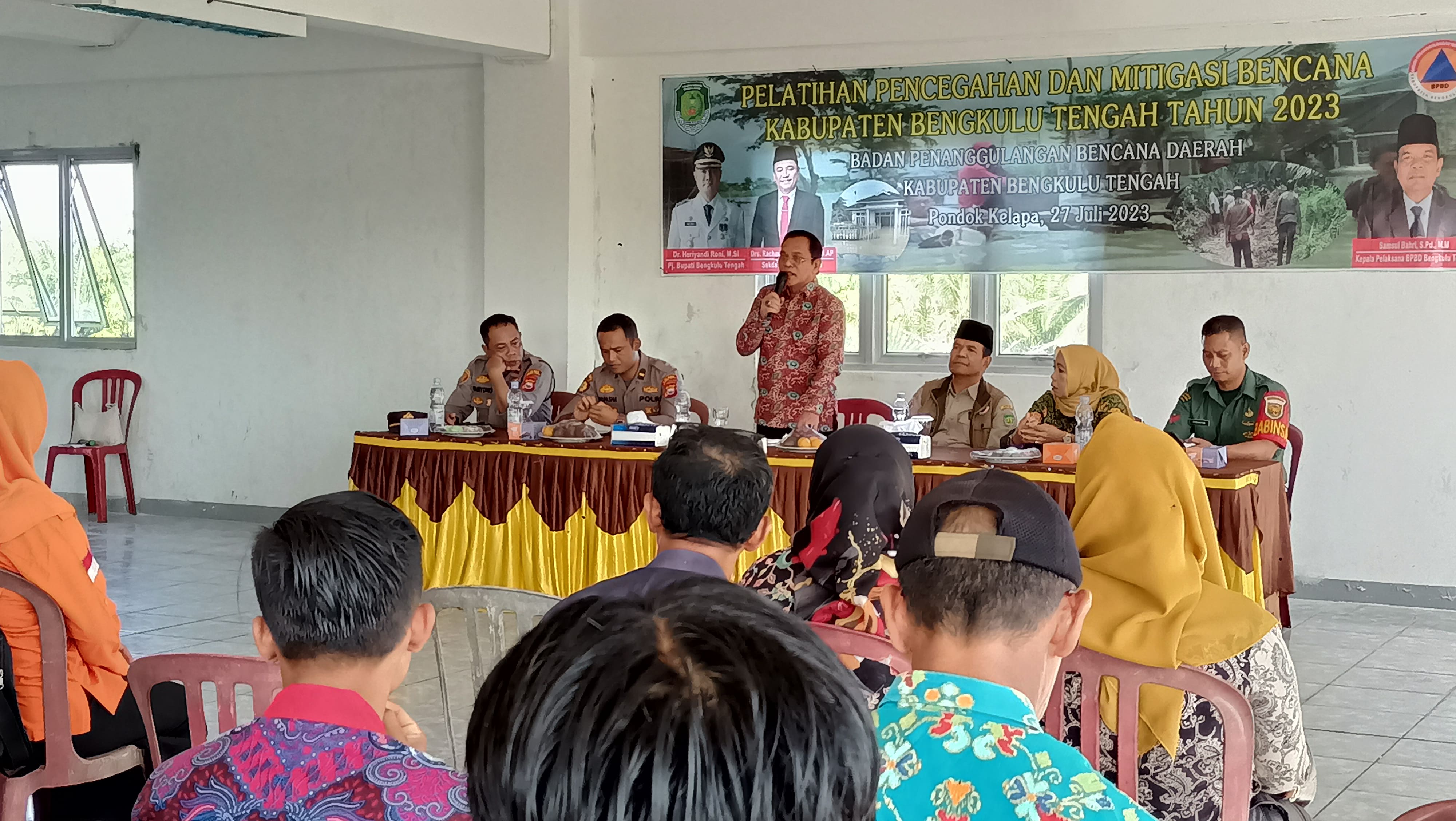 Bengkulu Tengah - Dalam rangka peningkatan pencegahan dan kesiapsiagaan menghadapi bencana di Kabupaten Bengkulu Tengah, BPBD Kabupaten Bengkulu Tengah bermaksud mengadakan Kegiatan Pelatihan Pencegahan dan Mitigasi Bencana Kabupaten Bengkulu Tengah Tahun 2023 yang akan diselenggarakan pada hari kamis tanggal 27 Juli 2023 yang bertempat Shelter Desa Pondok Kelapa, Kecamatan Pondok Kelapa. Kegiatan pelatihan tersebut dibuka oleh Staf Ahli Bupati Bidang Pemerintahan, Hukum dan Politik, Zamzami Syafei, S.IP, M.Si sebagai perwakilan Bapak Sekretaris Daerah Kabupaten Bengkulu Tengah. Adapun materi pelatihan dipaparkan oleh Kepala Pelaksana BPBD Kabupaten Bengkulu Tengah, Samsul Bahri, S.Pd, M.M, Agus Widianto, M.A.P dari MDMC Bengkulu, Ipda Rodi Pasah, S.H, M.Si dari Polres Bengkulu Tengah. Tampak hadir pula Wakapolsek Pondok Kelapa, Babinsa Pondok Kelapa, Camat/perwakilannya dari Desa Pondok Kelapa, Desa Sidodadi, Desa Sunda Kelapa, Desa Pagar Dewa, Desa Abu Sakim, Desa Kembang Ayun, dan Desa Padang Betuah, serta ASN dan Satgas BPBD Kabupaten Bengkulu Tengah. Dengan adanya kegiatan pelatihan pencegahan dan mitigasi ini diharapkan pengetahuan dan peningkatan kemampuan peserta dapat meningkat dalam mengatasi ancaman bencana dan bertindak apabila terjadi bencana alam. Serangkaian upaya dalam mitigasi bencana dapat mengurangi risiko bencana yang meliputi korban jiwa, kerusakan lingkungan, kerugian materil serta dampak psikologis. Bentuk mitigasi yang dapat diterapkan dalam kehidupan masyarakat dapat berupa mitigasi berbasis komunitas seperti katana, destana, kencana, SPAB, dan Jamaah Tangguh. Berdasarkan tindakan penanganan dan evakuasi bencana alam secara histori oleh BPBD Kabupaten Bengkulu Tengah, terdapat 6 jenis bencana alam yang menjadi ancaman masyarakat di wilayah Kabupaten Bengkulu Tengah yaitu banjir, tanah longsor,gempa bumi, puting beliung, karhutla dan tsunami.