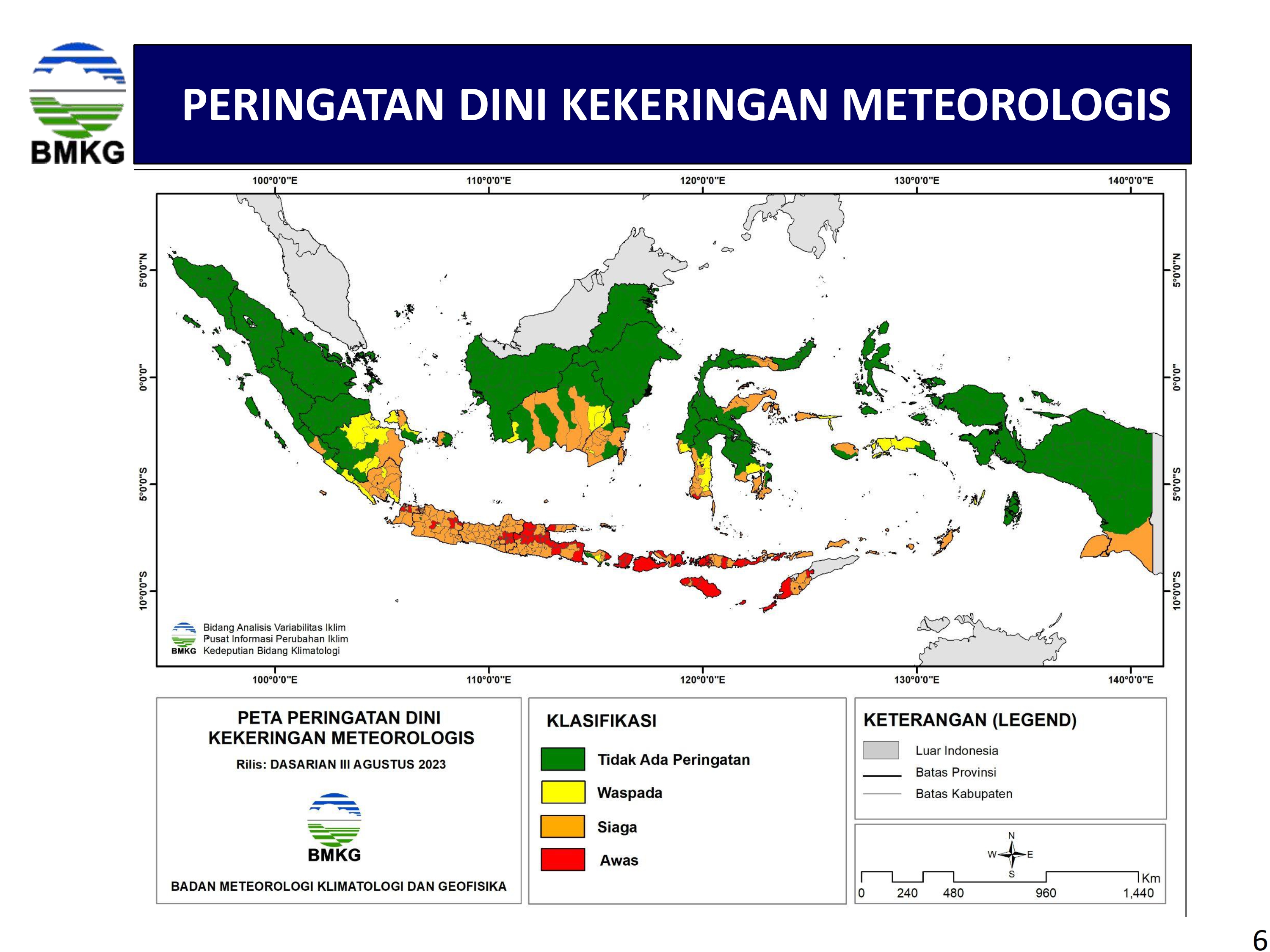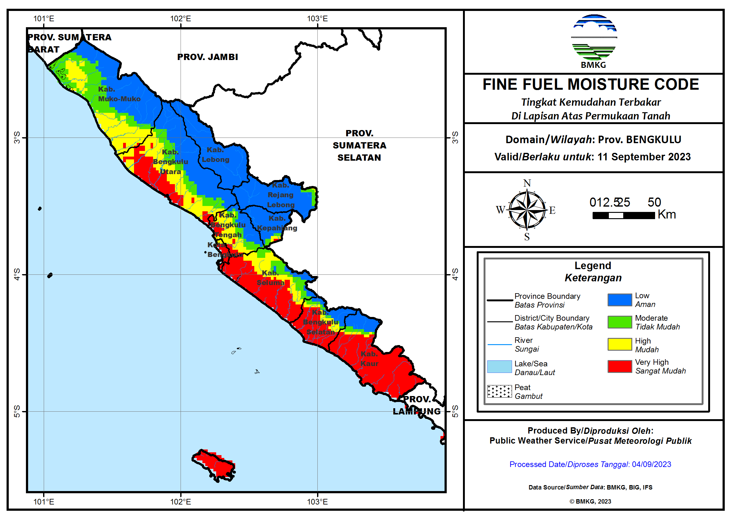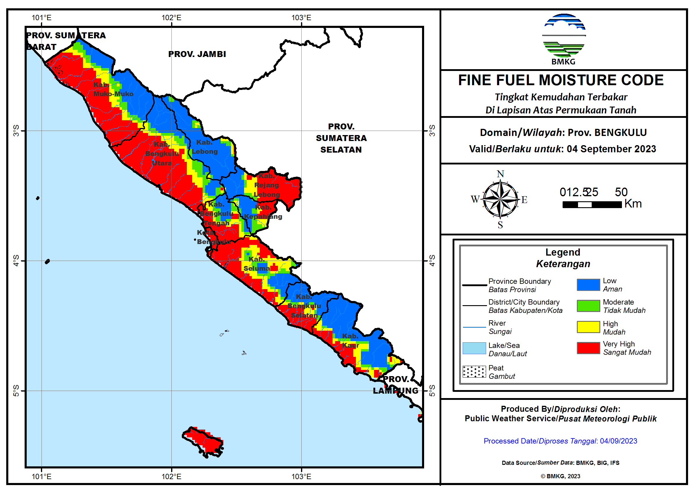 Berikut ini disampaikan pemberitahuan dari BBMKG Wil. II Tangerang Selatan, mengenai Peringatan Dini Waspada Karhutla (Kebakaran Hutan dan Lahan) pada dasarian I September 2023 pada Wilayah Kabupaten Bengkulu Tengah dengan prediksi curah hujan di bawah 50 mm per dasarian dengan peluang >90%. Adapun rekomendasi untuk daerah-daerah dengan peluang terjadinya curah hujan rendah di atas, perlu melakukan langkah antisipasi antara lain : a. Budi daya pertanian yang tidak membutuhkan banyak air b. Waspada kebakaran hutan, lahan dan semak c. Hemat penggunaan air bersih