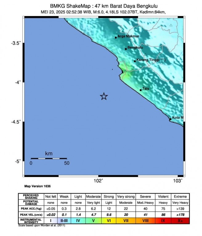 Bengkulu Tengah - Pada hari Jumat, tanggal 23 Mei 2025 pukul 02.52.37 WIB telah terjadi gempa bumi tektonik di wilayah laut pada jarak 55 km Barat Daya Kabupaten Bengkulu Tengah. Episenter gempa bumi terletak pada koordinat 4,18° LS ; 102,07° BT pada pukul 02.52 WIB yang bersumber dari sumber gempa dalam (intraslab) dan tidak berpotensi tsunami karena kedalaman hiposenter yang sangat dalam dengan kedalaman 84 km. Geologi Provinsi Bengkulu dipengaruhi posisi yang berada di zona Subduksi aktif dimana Lempeng Indo-Autralia menujam dibawah Lempeng Eurasia sehingga bagian lempeng yang berada di bawah mengalami tekanan dan terdorong ke atas akibat kompresi dari gaya tektonik yang bekerja dan menyebabkan terjadinya gempa yang berpusat jauh di bawah permukaan bumi. Berdasarkan informasi terkini dari BMKG dengan parameter sementara semula kekuatan magnitudo 6.3 SR dan kedalaman 10 km, menjadi parameter update kekuatan magnitudo 6.0 SR dan kedalaman 84 km. Adapun verifikasi dan pendataan lapangan sementara terdampak 49 unit rumah rusak dan 6 unit fasilitas umu rusak (kantor camat dan sekolah) dengan lokasi terdampak di 7 kecamatan (Talang Empat, Pondok Kubang, Pondok Kelapa, Karang Tinggi, Semidang Lagan, Taba Penanjung, dan Merigi Kelindang).
