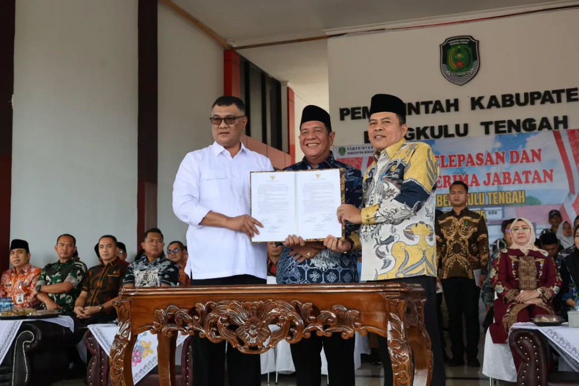 Bengkulu Tengah – Serah terima jabatan (sertijab) dari Pj. Bupati Bengkulu Tengah Dr. Heriyandi Roni, M.Si. kepada Bupati dan Wakil Bupati Kabupaten Bengkulu Tengah Periode 2025-2030, Drs. Rachmat Riyanto, S.T., M.A.P. dan Tarmizi, S.Sos., bertempat di Pendopo Bukit Kandis, Desa Ujung Karang pada Jumat (21/02/2025) yang dilaksanakan seiring apel pelepasan Pj. Bupati Bengkulu Tengah Dr. Heriyandi Roni, M.Si. Bupati Kabupaten Bengkulu Tengah diwakili Pj. Sekda Kabupaten Bengkulu Tengah Drs. Hendri Donal, S.H., M.H. dalam penandatanganan berita acara dan penyerahan memori jabatan. Acara dihadiri mewakili Gubernur Bengkulu Pj. Sekda Provinsi Bengkulu, mewakili Bupati Kabupaten Bengkulu Tengah Pj. Sekda Kabupaten Bengkulu Tengah, Forkopimda Kabupaten Bengkulu Tengah, Perwakilan Ketua Pengadilan Negeri dan Pengadilan Agama Argamakmur, Para Asisten dan Staf Ahli Bupati, pengurus TP PKK, Ketua DWP dan pengurus, Ketua IKBD, Ketua IAD, Ketua Bhayangkari, Ketua Persit, Kepala OPD, Camat, Kabag, Kades, Tokoh Masyarakat, Tokoh Adat dan undangan lainnya.